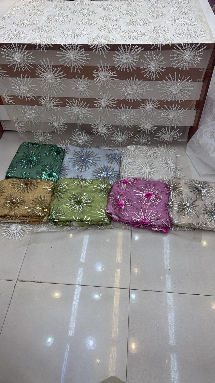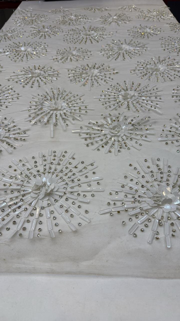 Introduce a new level of elegance to your bridal and couture collections with this exquisite white 3D floral hand-embellished fabric. Designed with meticulous craftsmanship, this fabric features radiant floral burst motifs, meticulously created using a blend of sequins, beads, and crystals that form a stunning starburst effect across the entire surface.