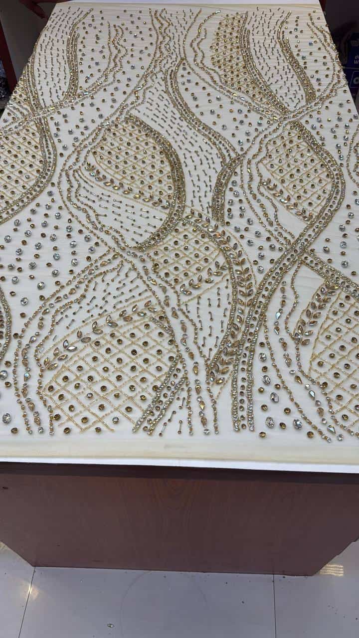 Make a bold yet sophisticated statement with this Gold Crystal Beaded Embellished Tulle, crafted for designers who appreciate modern elegance with a luxurious finish. Set on a soft ivory illusion tulle base, this fabric features intricately hand-placed gold crystals, rhinestones, and metallic beads arranged in flowing wave and lattice-inspired patterns.
