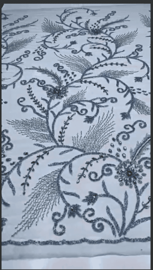 Introducing a breathtaking designer blue vine fabric crafted to elevate any luxury couture or formalwear creation. Set on a serene sky-blue mesh base, this fabric is adorned with an intricate constellation of deep blue crystals, shimmering beads, and delicate floral appliqués that create a mesmerizing, flowing pattern.