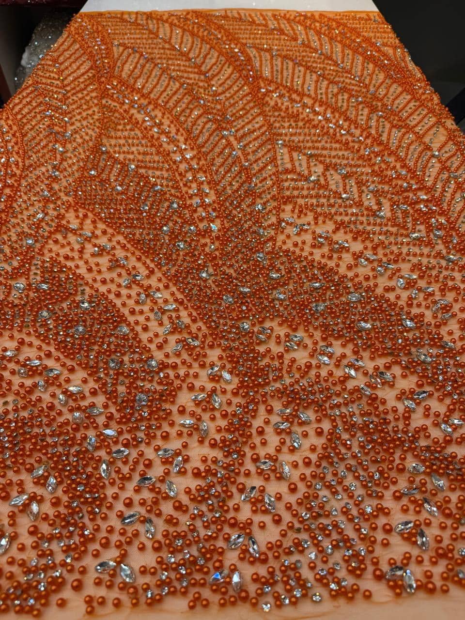 Burnt Orange Crystal Beaded Tulle – Luxury Couture Fabric