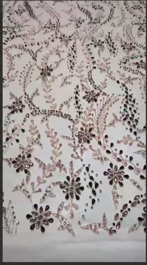 Enchanted Vine is a captivating crystal embellished tulle fabric that weaves nature’s elegance into high fashion. Set on a delicate blush tulle, intricate vine and leaf motifs are brought to life with glistening silver crystals and deep garnet teardrop gems. Each bead and stone is meticulously placed to create a rhythmic, organic flow — perfect for statement couture creations.