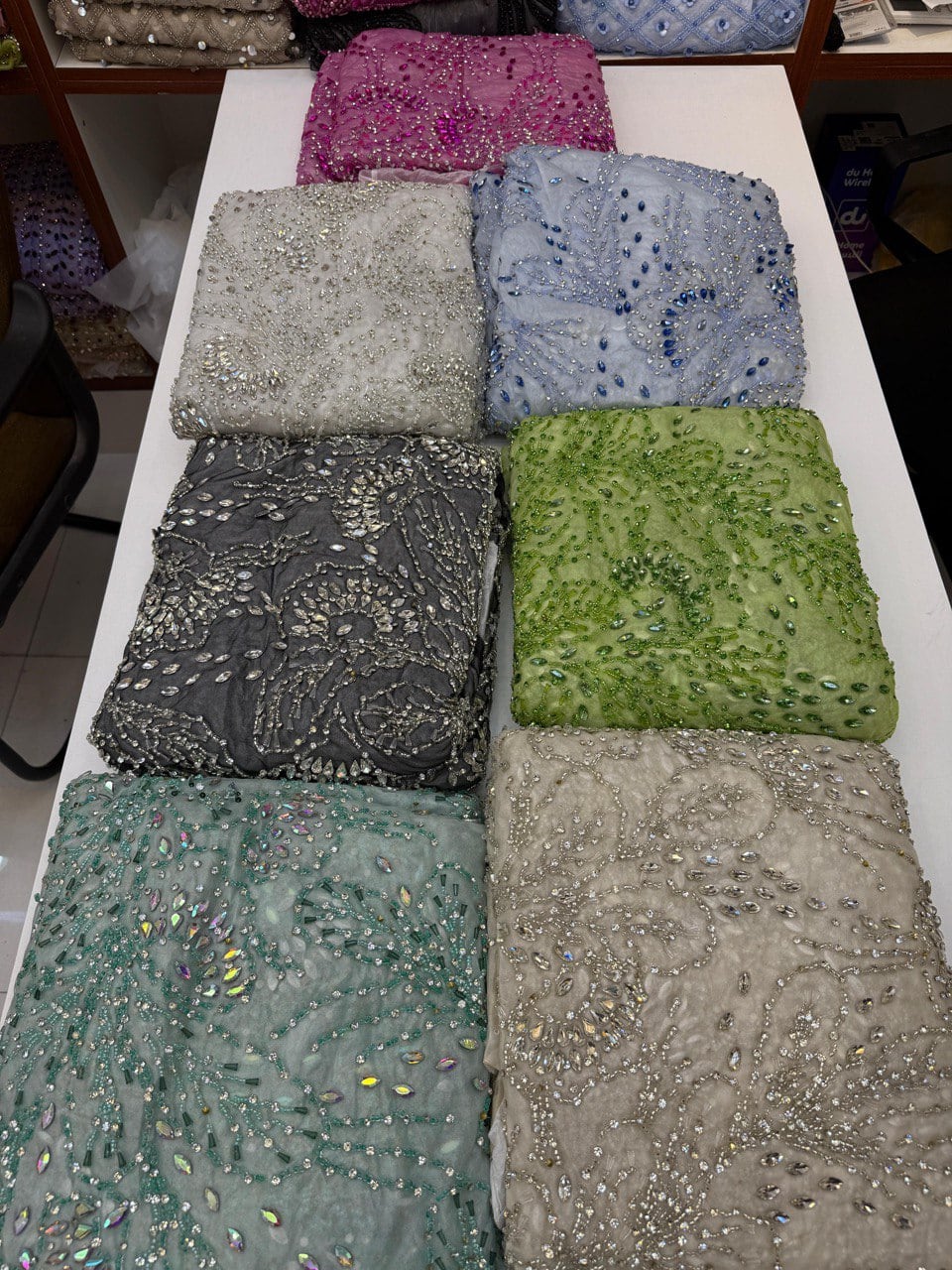Step into timeless sophistication with this graceful crystal embellishments fabric, showcasing a delicate botanical vine design. Intricately arranged stones and crystals form sprawling floral branches, exuding a soft, feminine charm ideal for bespoke bridal and eveningwear creations.
