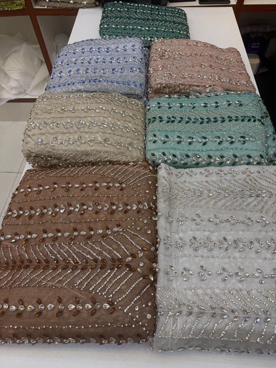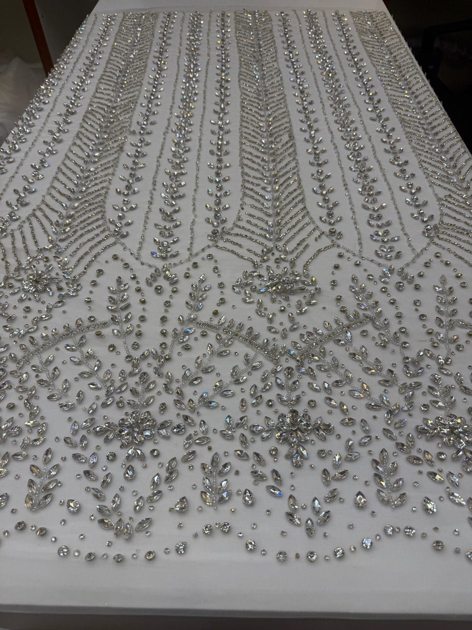 Crafted on a rich blush-pink crystal rhinestone mesh , it features flowing vine-like patterns adorned with blush pink rectangular stones and sparkling clear crystals. Each embellishment is meticulously arranged to mimic the graceful fall of petals and droplets, creating a mesmerizing, fluid effect.