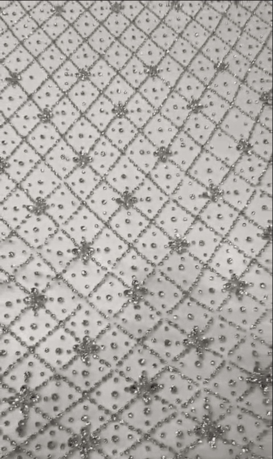 Precision meets glamour in this breathtaking diamond-lattice beaded tulle. A delicate silver chain-stitch grid maps perfect diamond shapes across a soft ivory tulle ground, and at every intersection — a hand-set starburst crystal cluster blooms like a tiny constellation. Within each diamond cell, scattered rhinestones of varying sizes float freely, catching light from every angle like morning dew on a spider’s web.