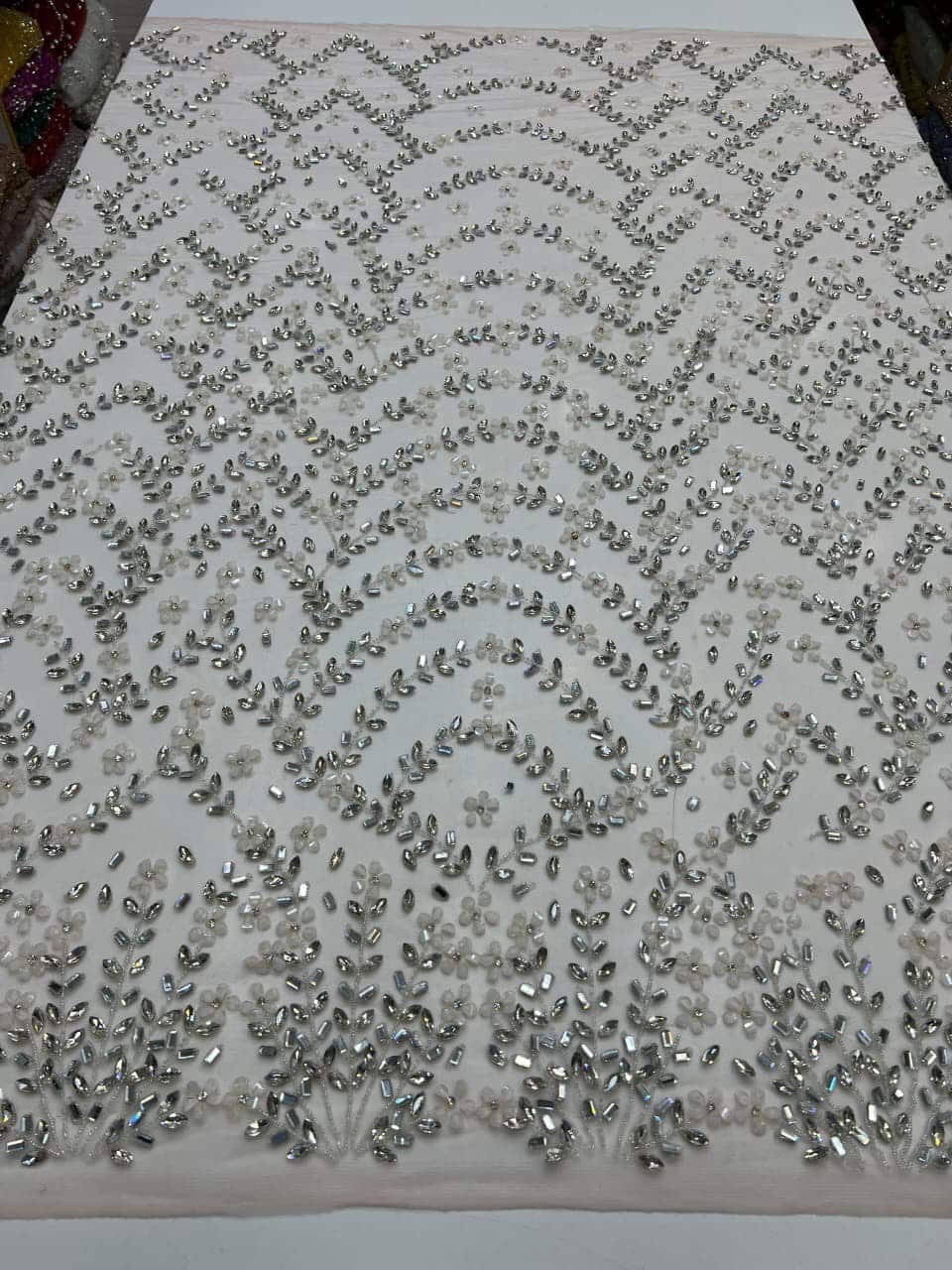 Experience the essence of sophistication with this elegant couture hand-embellished white crystal fabric. Designed for haute couture and luxury fashion, this material features a delicately structured pattern that blends elegance, sparkle, and refinement in every inch.