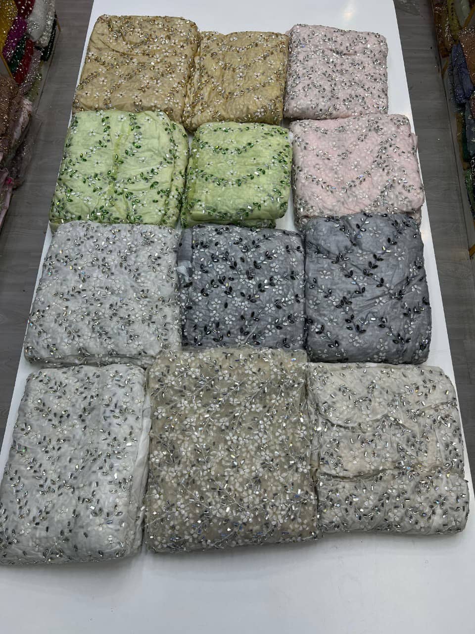 Every embellishment is precisely hand-applied, giving the fabric a radiant, glistening finish.
