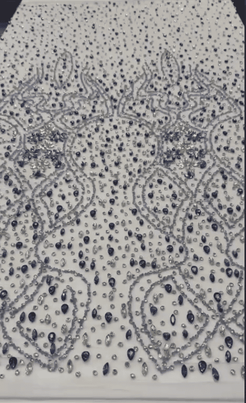 Every inch of this fabric is meticulously adorned with hand-placed crystals, beads, and rhinestones, forming an intricate mirrored motif that radiates elegance and sophistication. The shimmering combination of sapphire-blue stones and silver-clear crystals creates a dynamic surface that catches the light beautifully from every angle.