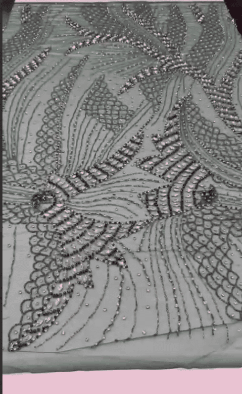 The artistic wave-inspired motifs create movement across the fabric, blending structured embroidery with scattered crystal detailing for a rich, dimensional finish. Each section is carefully embellished to deliver a refined balance of sparkle and sophistication, making it perfect for fashion-forward designers seeking uniqueness.