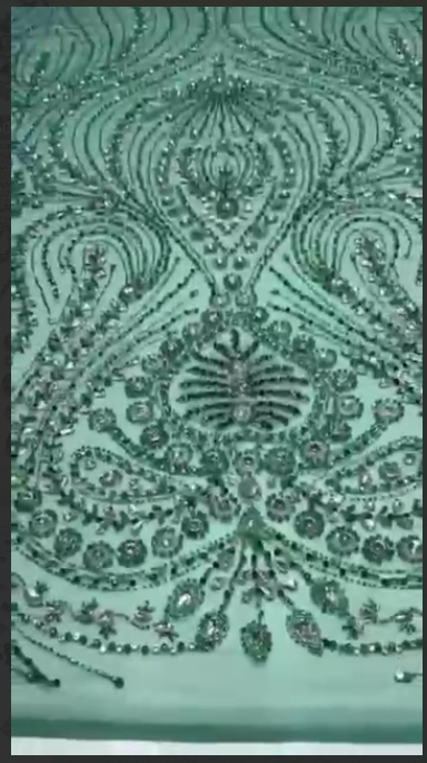 Emerald Royale is a celebration of structured elegance and artisanal luxury. Set on a soft mint-green embellished tulle, the fabric features a striking geometric diamond pattern, each segment meticulously adorned with rows of green seed beads, shimmering sequins, and crystal-cut accents. Delicate emerald-petal floral appliqués add a couture finish, making it the perfect blend of symmetry and opulence.