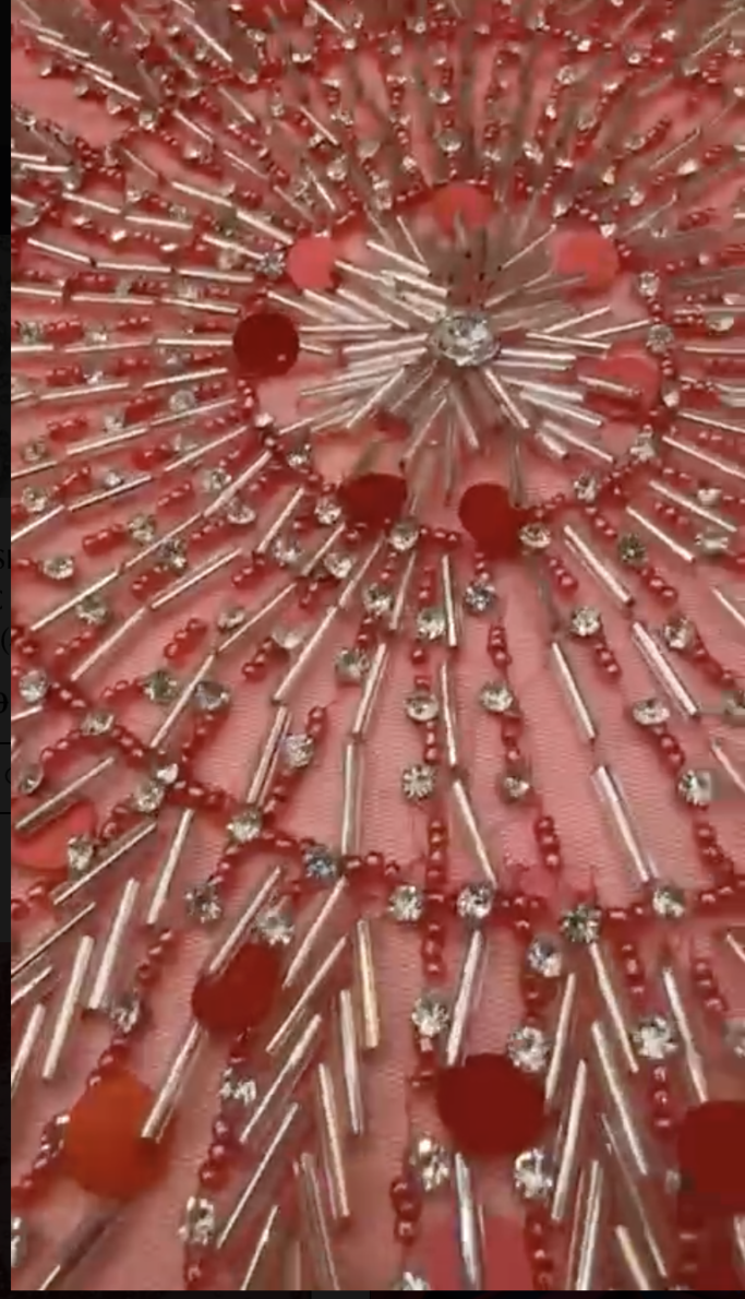 Soft, radiant, and exquisitely detailed, this Ethereal Sparkle Crystal Embellished Tulle is designed for designers who want Couture Elegance with a dreamy finish. Set on a delicate red illusion tulle base, the fabric is richly adorned with silver crystals and subtle red-toned stones, carefully arranged into flowing vertical motifs and floral clusters that create graceful movement and luminous depth.