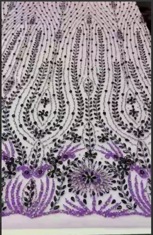 This luxurious textile showcases an exquisitely handcrafted beaded fabric with intricate arrangement of jet-black and crystal beadwork forming elongated, teardrop-inspired motifs that flow gracefully across a soft, sheer base. Each pattern is meticulously designed with leaf-shaped beads, delicate floral clusters, and shimmering accents that catch the light from every angle.