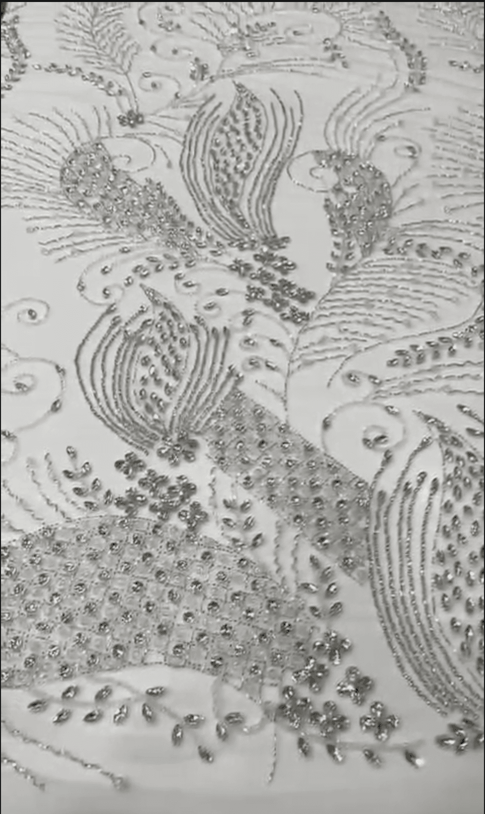 This is fabric as fine art. Sweeping across a Fantasia Beaded Lace Fabric, this extraordinary hand-embroidered lace tells a story of movement, nature and light — all rendered in silver thread, beads and crystals by the steady hands of master artisans.