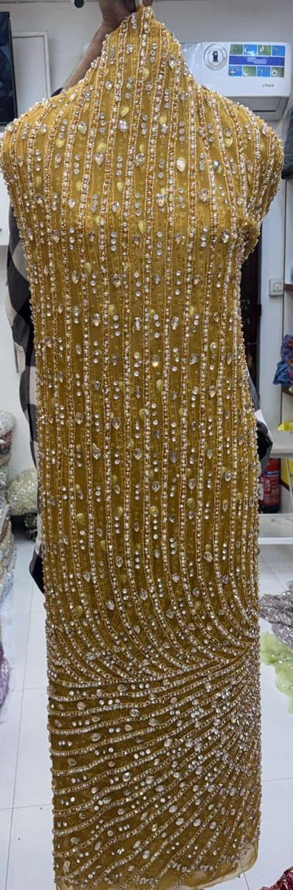 Create unforgettable couture pieces with this radiant gold embellished fabric—crafted for fashion moments that deserve to shine.