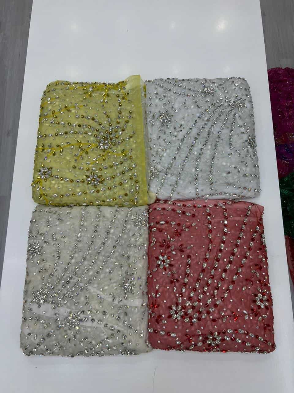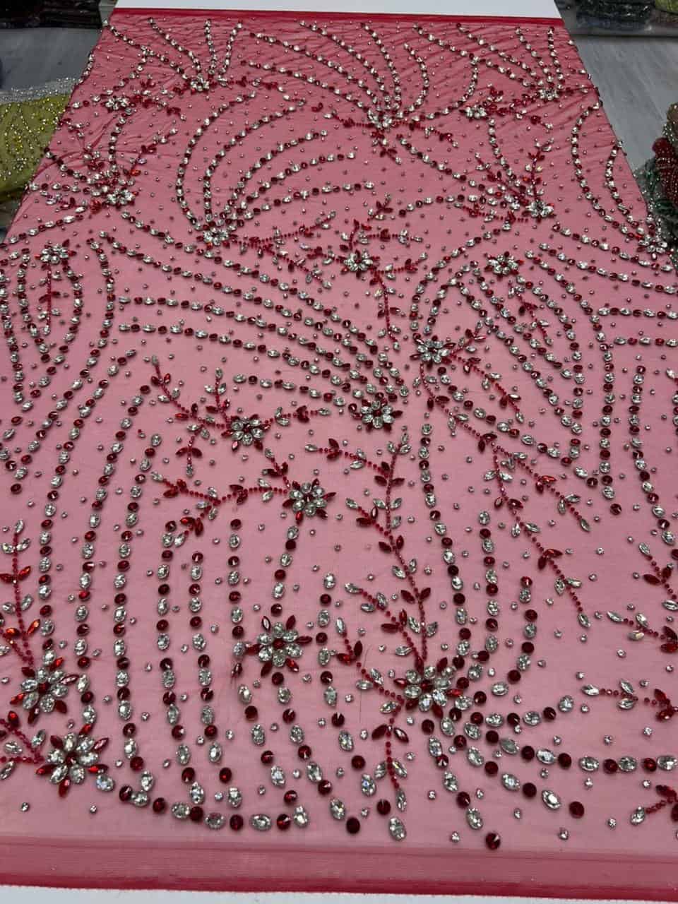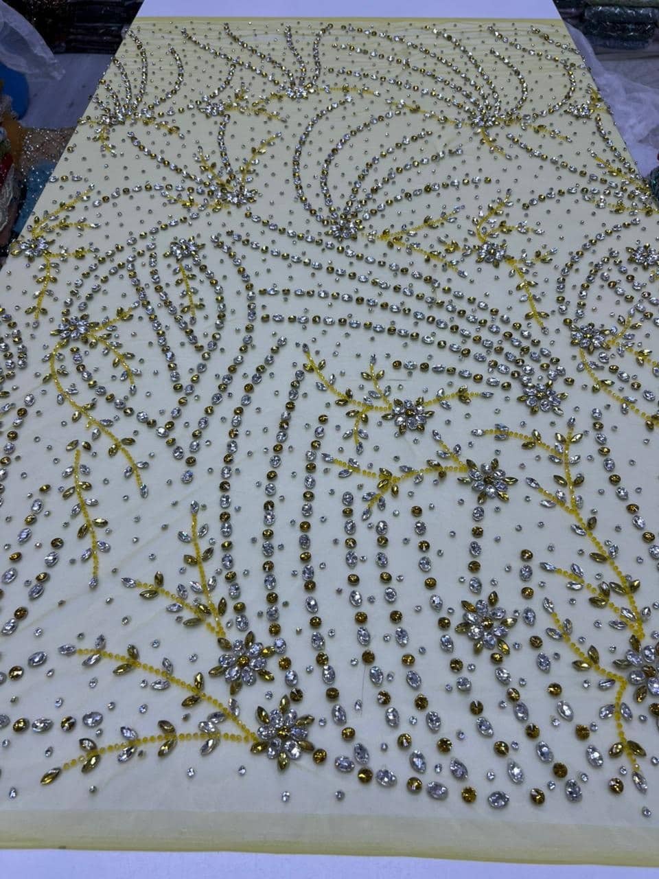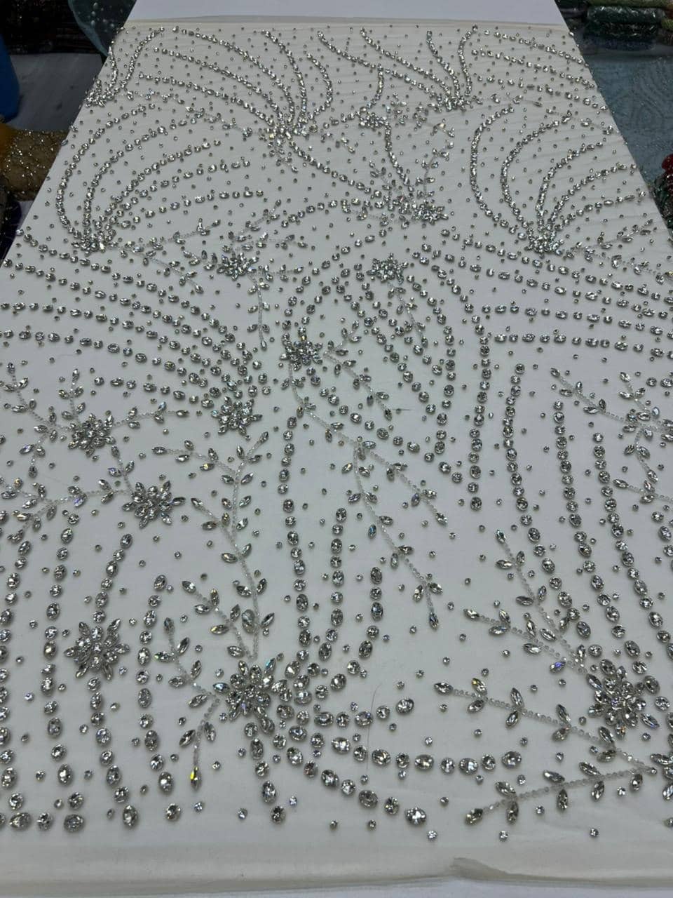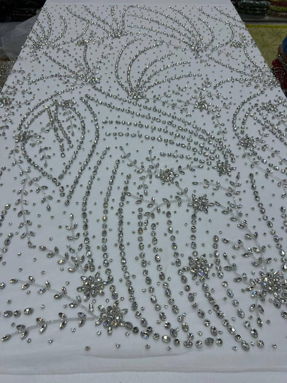 Step into timeless sophistication with this graceful hand-beaded embellishment fabric, showcasing a delicate design. Intricately arranged stones and crystals form sprawling floral branches, exuding a soft, feminine charm ideal for bespoke bridal and eveningwear creations.