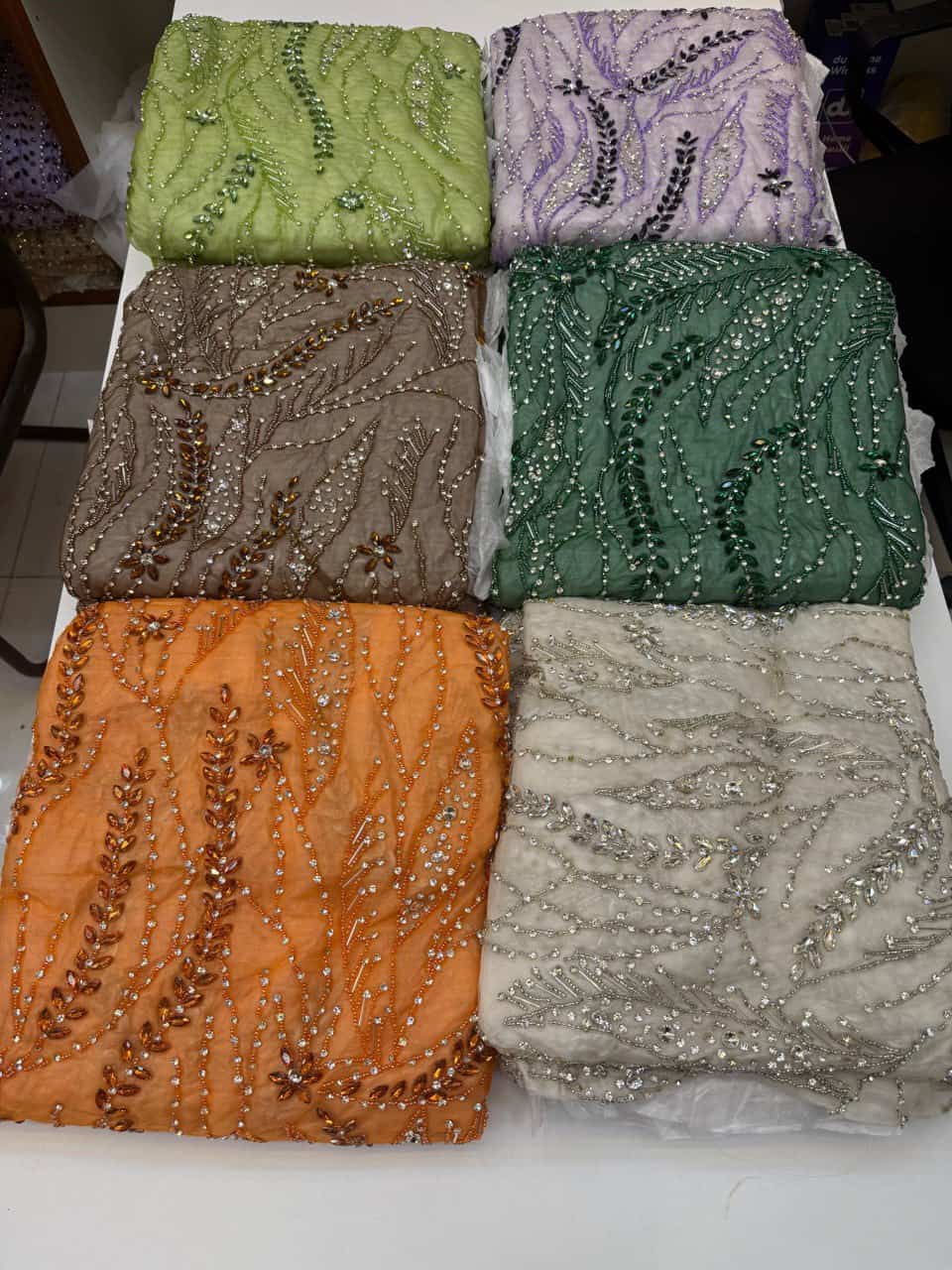 Step into timeless sophistication with this graceful hand beaded embellishments fabric, showcasing a delicate botanical vine design. Intricately arranged stones and crystals form sprawling floral branches, exuding a soft, feminine charm ideal for bespoke bridal and eveningwear creations.