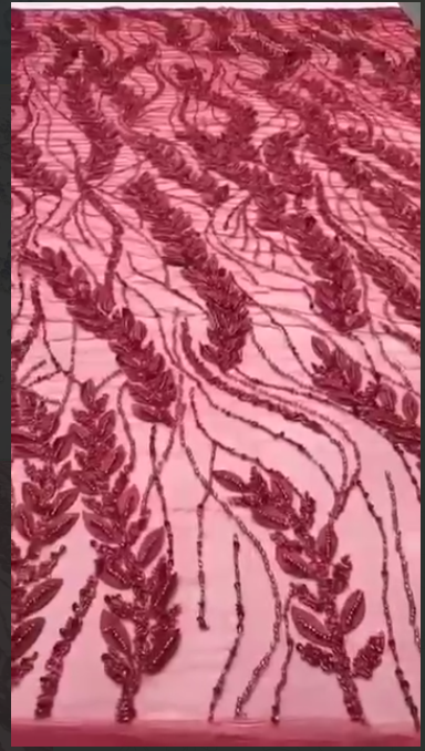 A bold statement of passion and power, this fabric features an organic flower-like bead arrangement that dances across a vibrant hand-beaded luxury mesh base. Each shimmering bead is meticulously hand-applied to create fluid, vertical wave patterns — elongating the silhouette and radiating pure luxury.