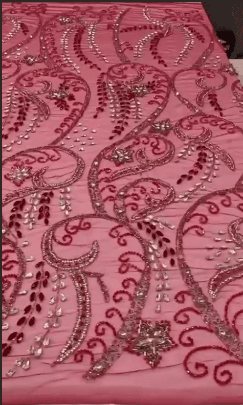 Perfect for bridal gowns, evening wear, couture dresses, luxury abayas, lehengas, and statement overlays, this fabric embodies timeless elegance and artisanal craftsmanship.