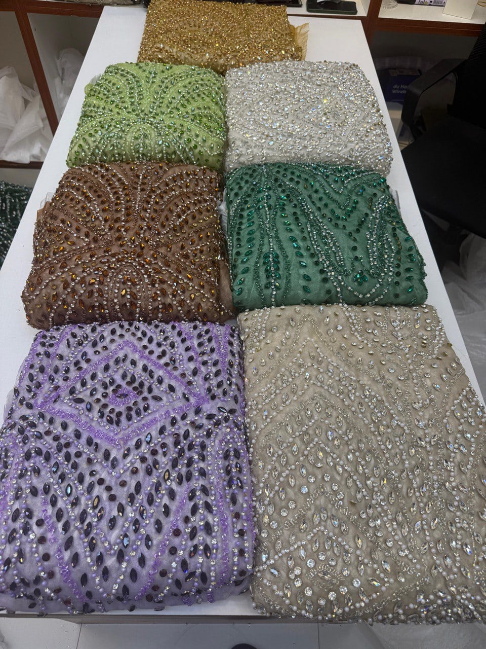 Under soft light, the hand-beaded surface shimmers like dew on silk — a celebration of patience, precision, and passion. This fabric doesn’t just decorate; it transforms a garment into a piece of wearable art.