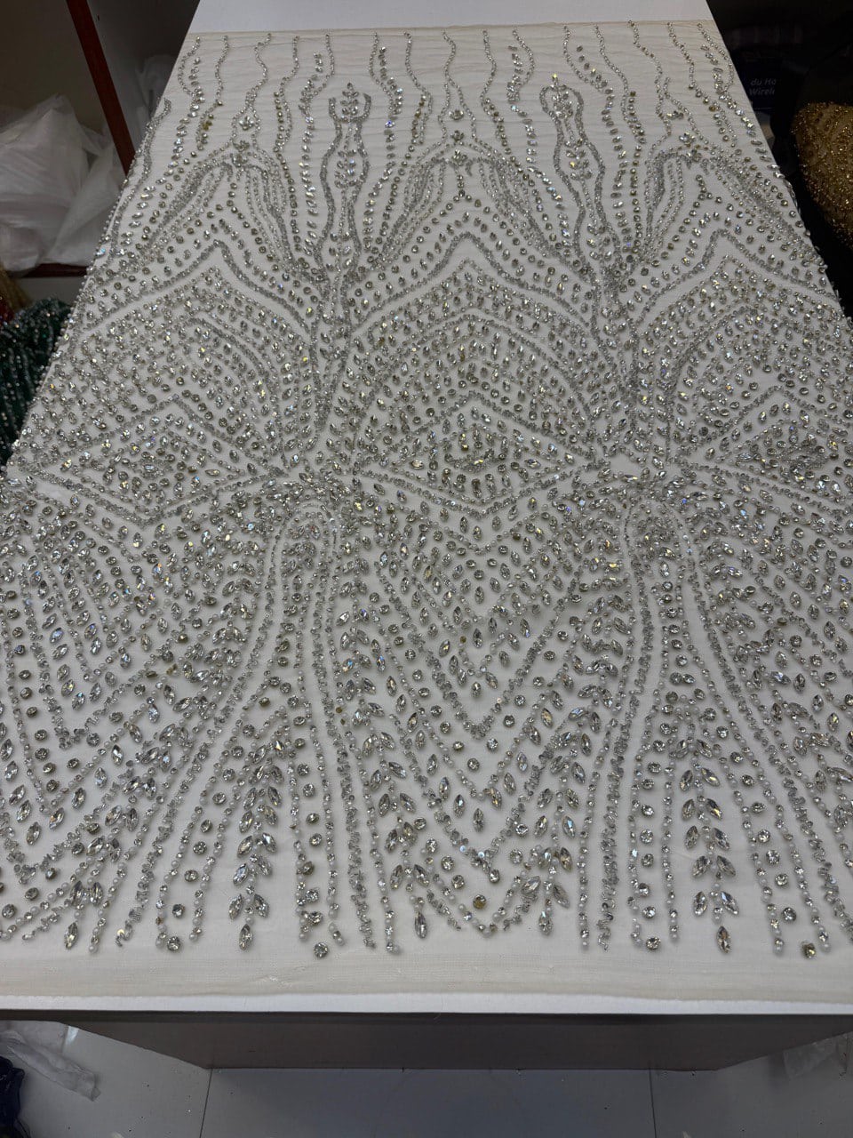 Experience the artistry of elegance with this stunning handcrafted luxury beaded crystal fabric. Each shimmering stone is meticulously placed to create a breathtaking pattern that radiates sophistication and glamour. Perfect for couture gowns, bridal wear, and statement fashion pieces, this intricate design transforms fabric into pure luxury.