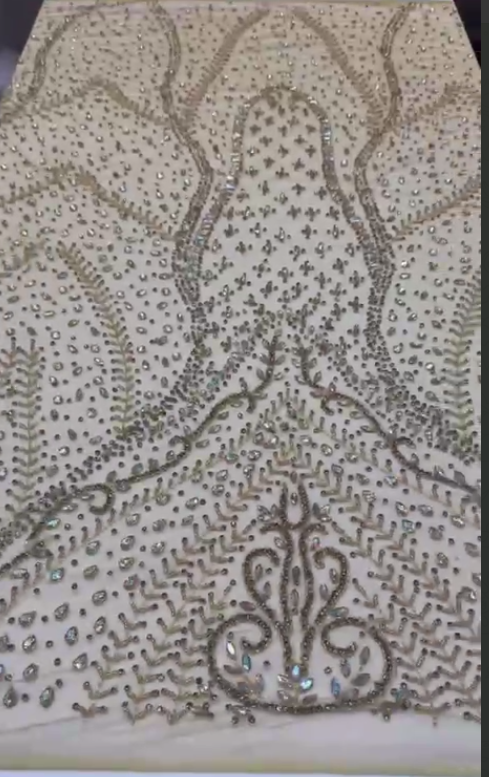 Crafted for those who dress to be remembered, this fabric is an embodiment of pure elegance and intricately hand-beaded luxury. Every inch of this masterpiece is adorned with delicate beads and stones, arranged in a flowing, symmetrical pattern that speaks of grace and grandeur.