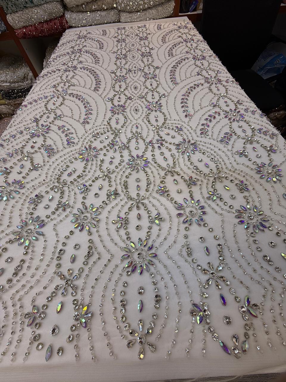 Refined and breathtaking, this Ivory Crystal Embellished Tulle is crafted for luxury couture and unforgettable statement pieces. Set on a soft ivory illusion tulle base, the fabric is lavishly decorated with iridescent crystals, clear rhinestones, and marquise-cut stones, intricately arranged in flowing symmetrical patterns and radiant floral motifs.