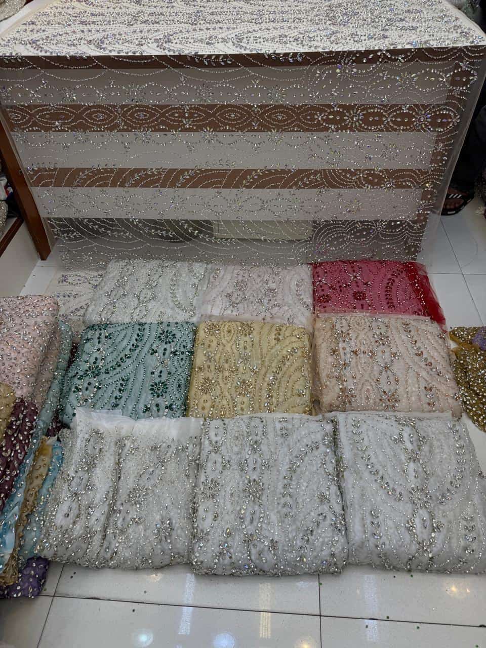 The design creates graceful movement across the fabric, reflecting light with a multi-dimensional sparkle that shifts beautifully from every angle. Its balanced embellishment density offers a rich, couture finish while remaining lightweight and comfortable to wear.
