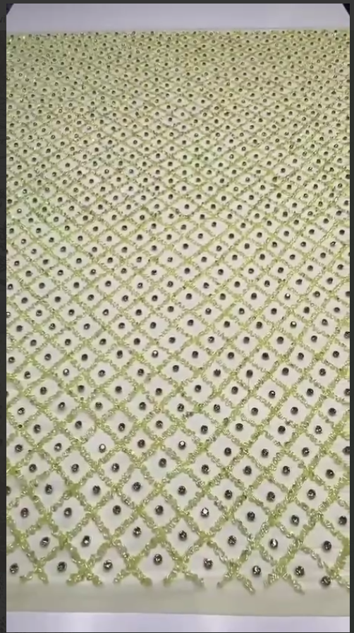 The Crystal Bloom Mesh is a stunning marriage of structure and sparkle. Set against a soft white tulle, the fabric features a flawless diamond lattice pattern meticulously outlined with shimmering clear rhinestones. At each intersecting point blooms a delicate crystal flower, crafted with teardrop stones in vibrant jewel tones — sapphire, emerald, ruby, amber, and topaz — for a playful yet regal finish.