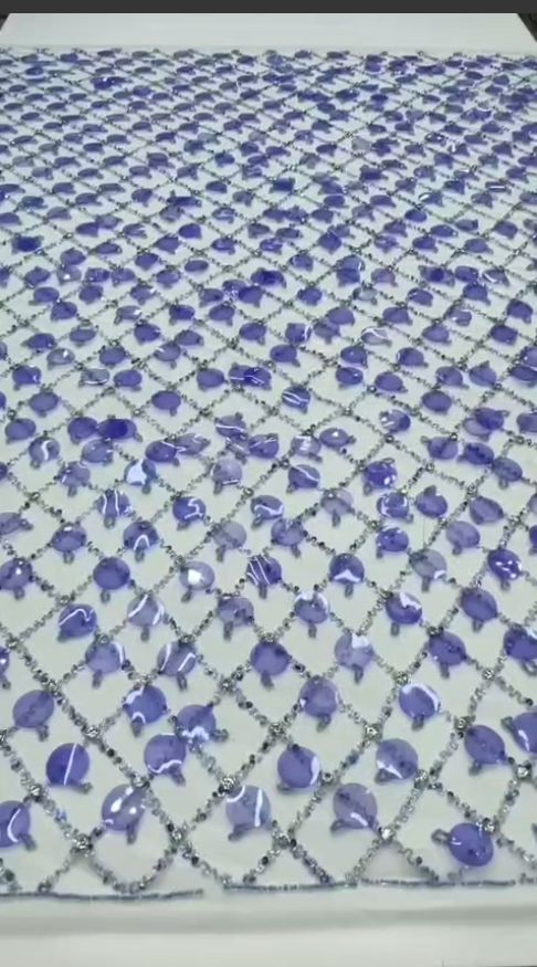 The structured criss-cross beadwork forms a stylish diamond grid, giving the fabric a modern, high-fashion appeal perfect for runway-inspired looks.