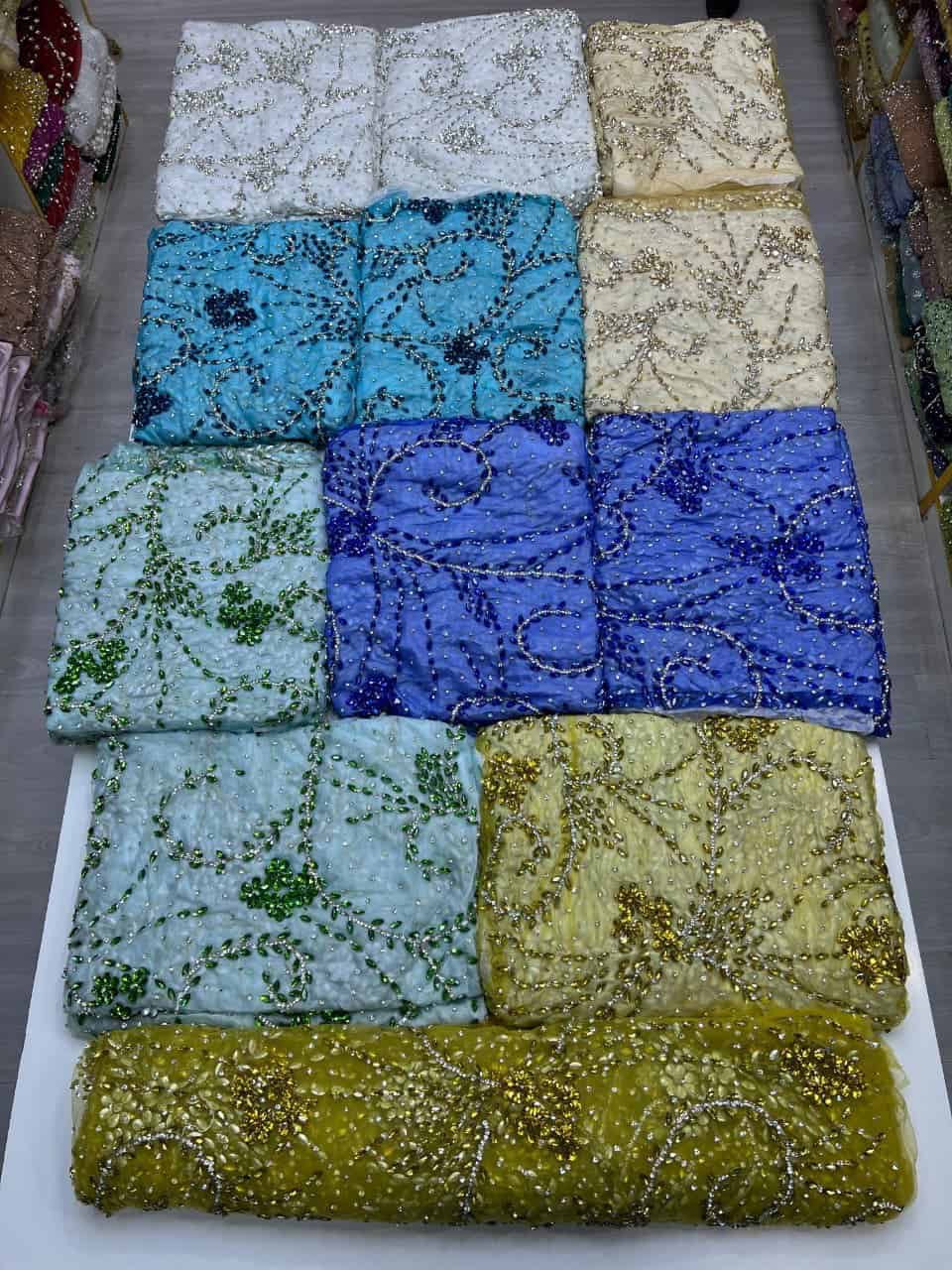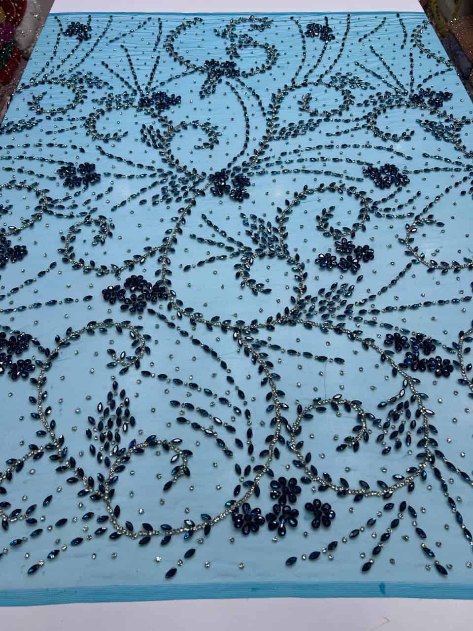 Introducing a breathtaking designer fabric crafted to elevate any luxury couture or formalwear creation. Set on a serene sky-blue mesh base, this fabric is adorned with an intricate constellation of deep blue crystals, shimmering beads, and delicate floral appliqués that create a mesmerizing, flowing pattern.