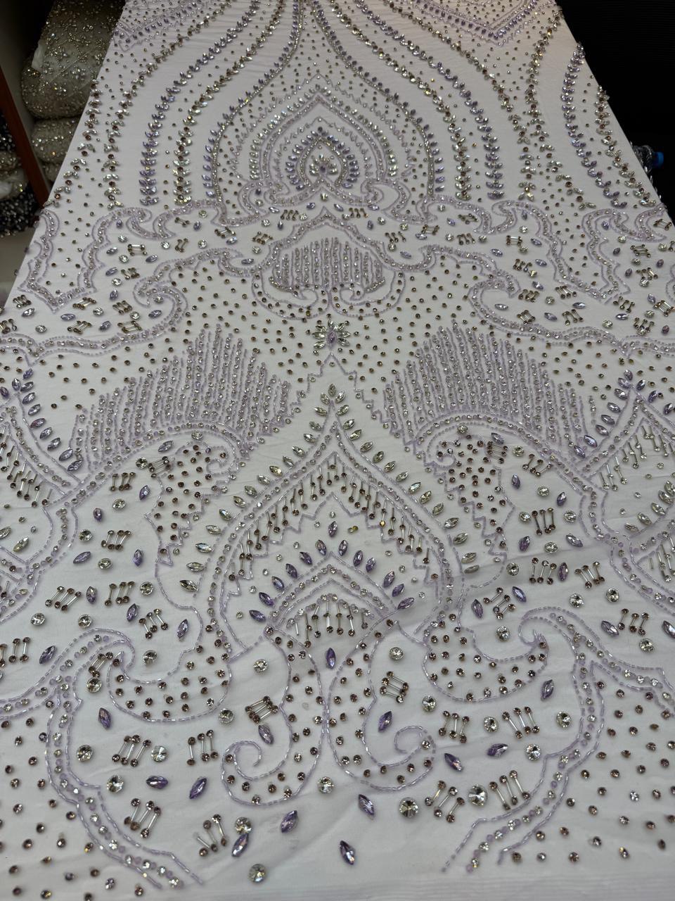 This breathtaking luxury hand-embellished fabric showcases an opulent blend of artistry and elegance. Designed on a soft ivory mesh base, the surface features intricate symmetrical patterns inspired by classic architectural and ornamental motifs. Rows of delicate beadwork cascade gracefully, creating depth, structure, and a regal visual flow.