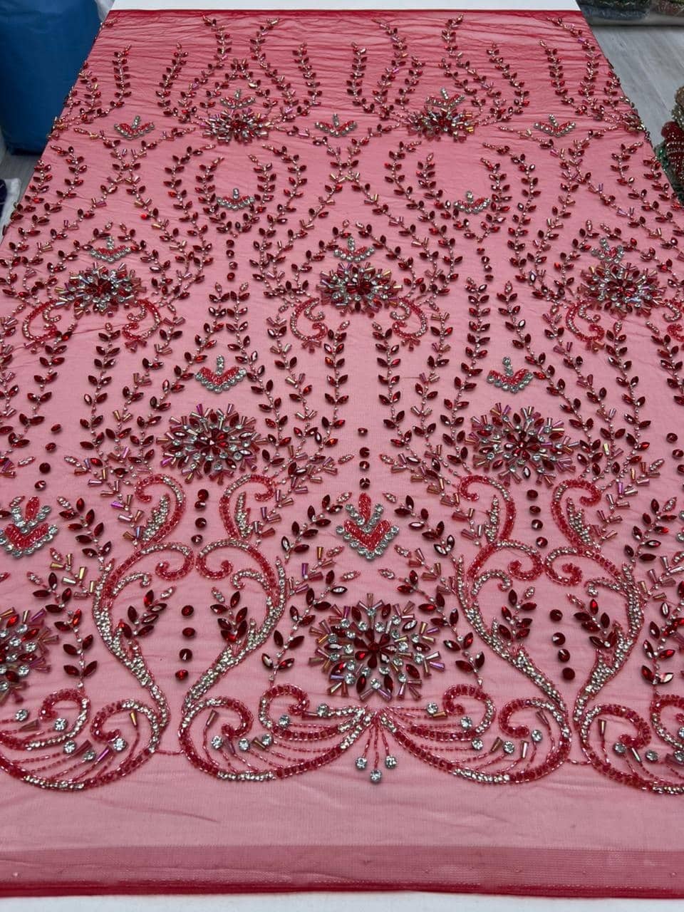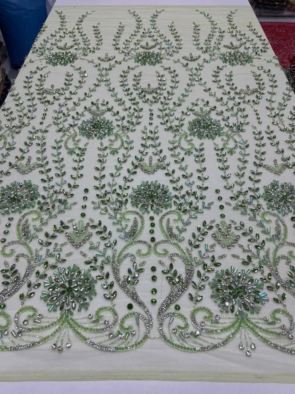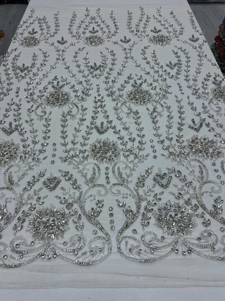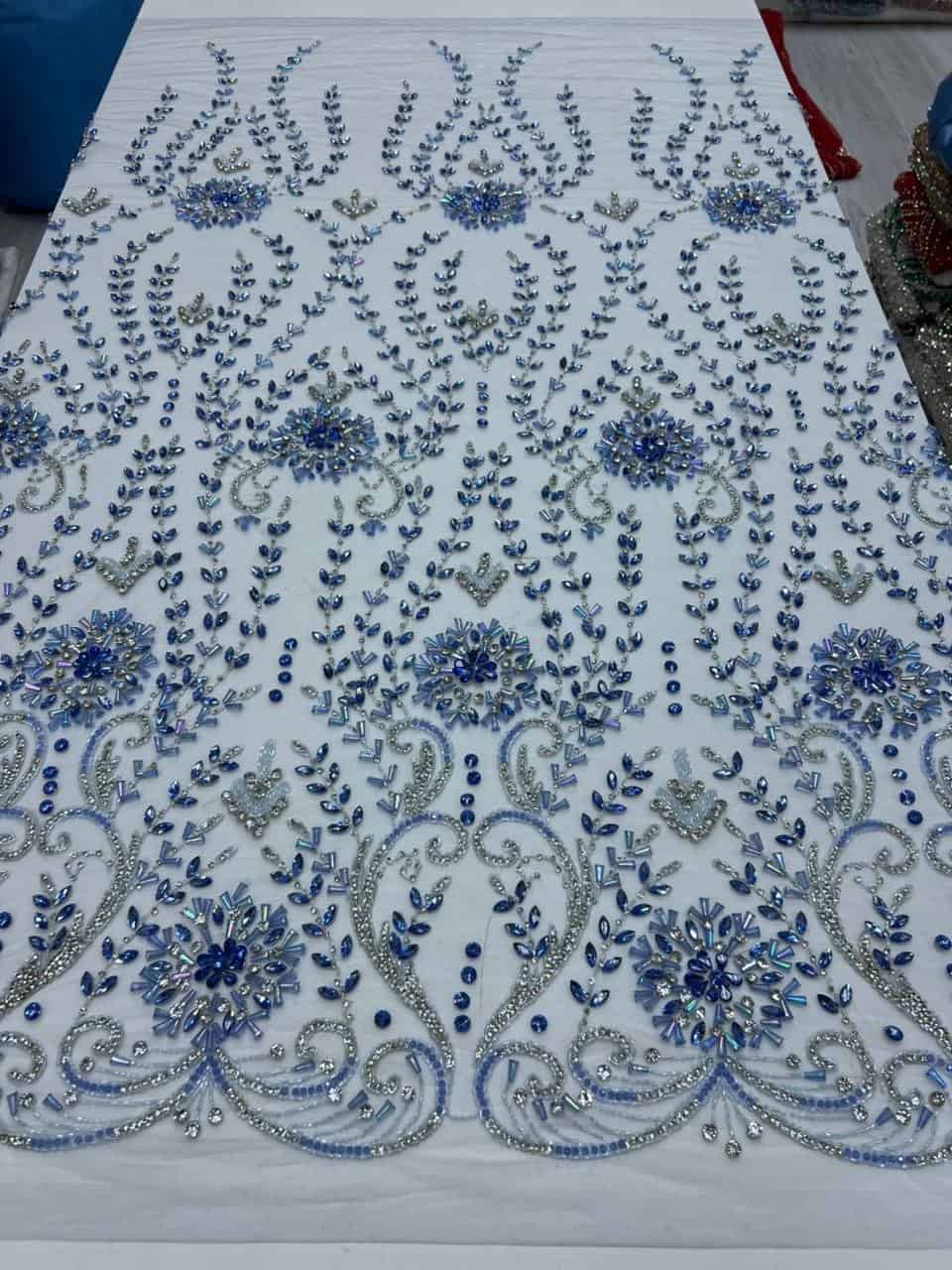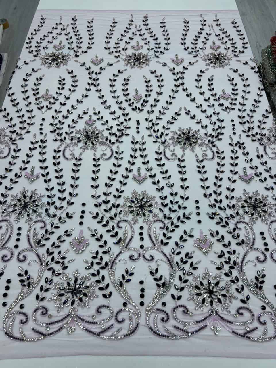 This breathtaking luxury hand-embellished crystal fabric showcases an opulent blend of artistry and elegance. Designed on a soft ivory mesh base, the surface features intricate symmetrical patterns inspired by classic architectural and ornamental motifs. Rows of delicate beadwork cascade gracefully, creating depth, structure, and a regal visual flow.