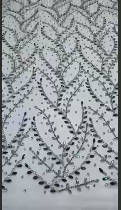 The Midnight Bloom fabric captures elegance in motion with its fluid, botanical crystal arrangement. Set against a delicate sheer white floral mesh, deep royal teal stones and shimmering crystals intertwine in graceful vine and petal motifs. The result is a fabric that feels both regal and romantic, perfect for designs that demand presence.