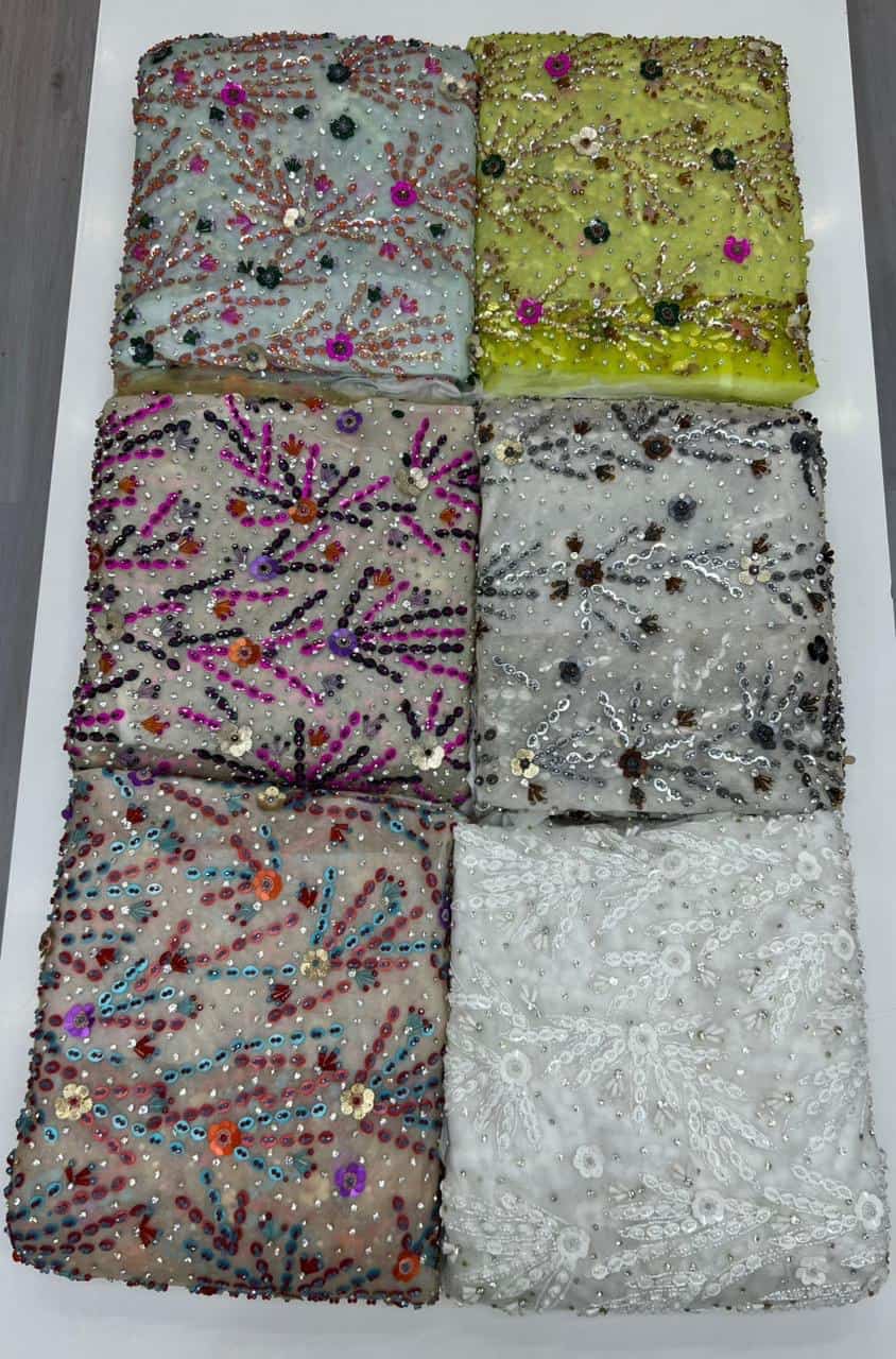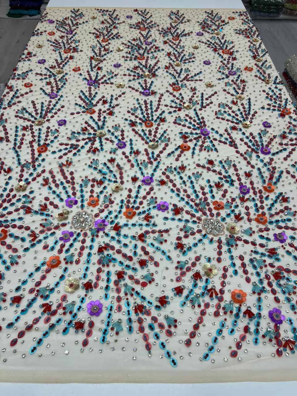 Bring vibrant elegance to your designs with this stunning multicolor hand-embellished mesh fabric, carefully crafted to deliver both brilliance and artistic detail. Designed with a captivating arrangement of radiant crystals, floral accents, and geometric beadwork, this fabric embodies luxury and creativity in every inch.