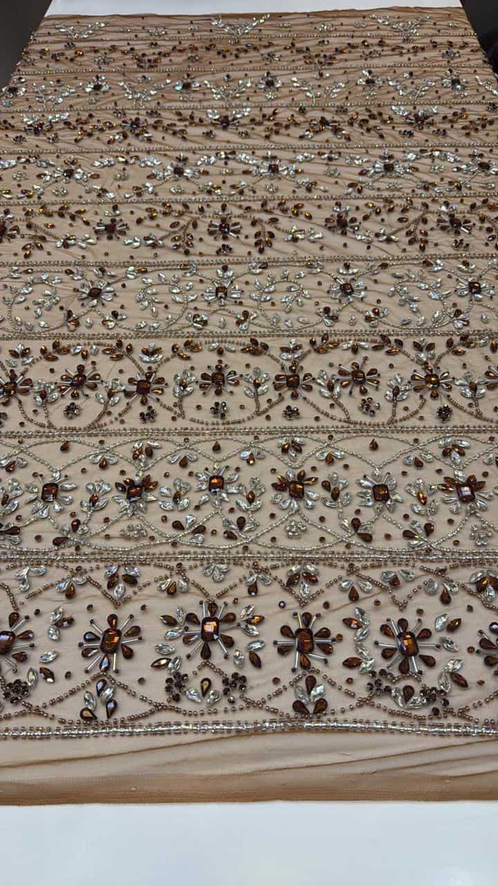Elevate your designs with this Nude Brown Crystal Beaded Lace, a refined luxury fabric crafted for timeless elegance. Set on a soft nude illusion tulle base, this fabric features intricately arranged floral motifs embellished with warm amber stones, clear crystals, and delicate beadwork. The symmetrical horizontal layout creates a rich, couture-inspired finish with exceptional depth and sparkle.