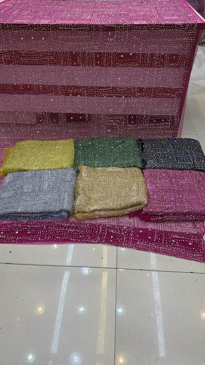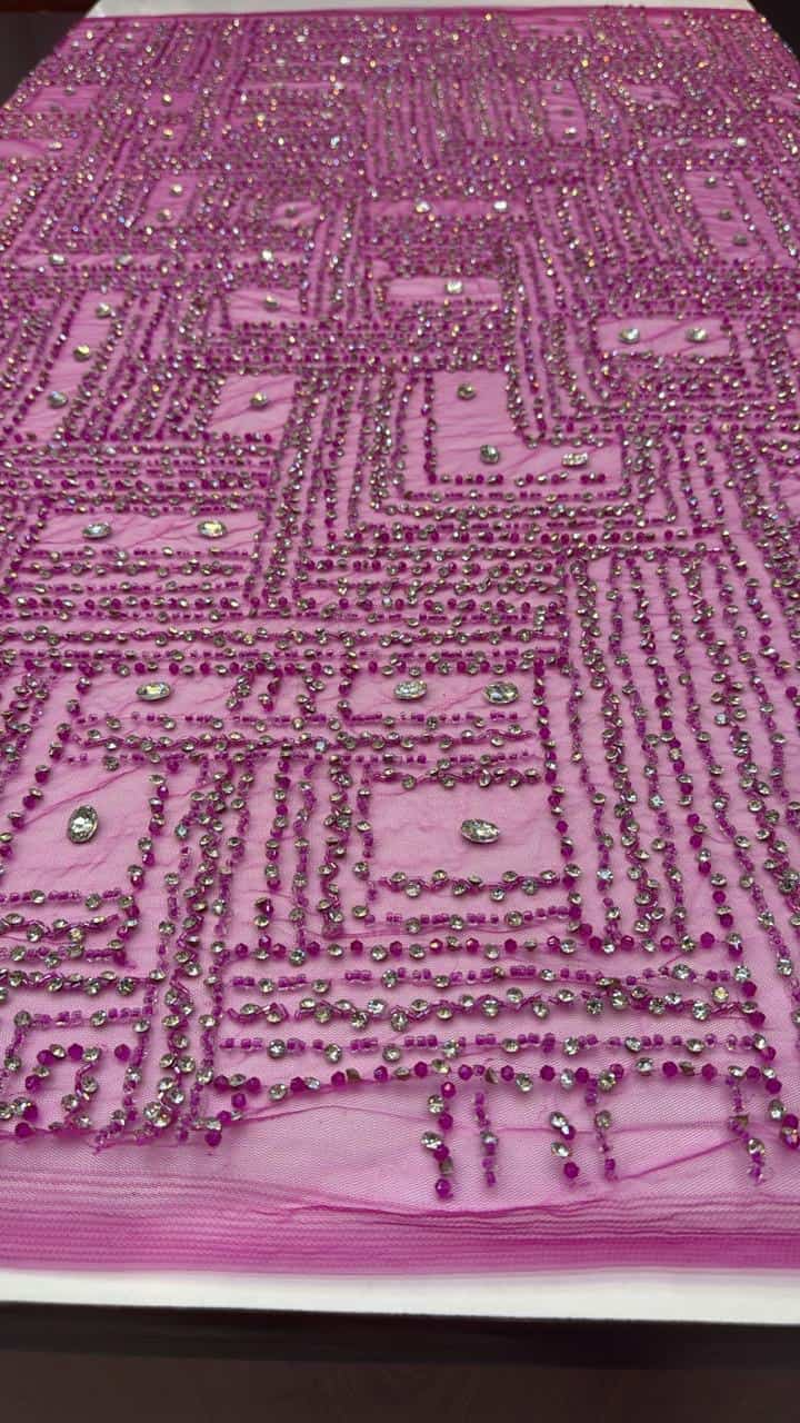 Add pure glamour to your designs with this stunning pink crystal-embellished mesh fabric, crafted with extraordinary attention to detail. This statement piece features a rich geometric layout of hand-applied rhinestones, sparkling beads, and reflective crystals arranged over a soft pink mesh base.