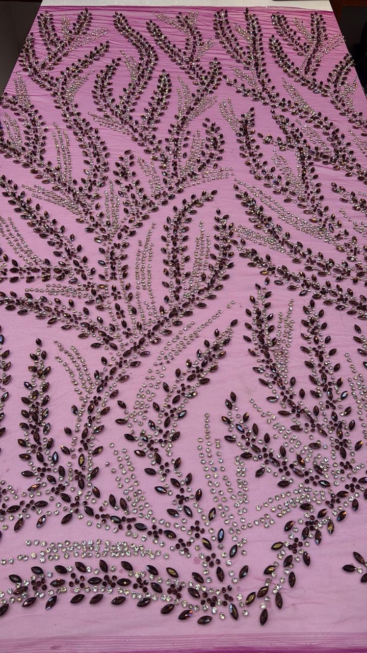 This stunning Plum Crystal Leaf Beaded Tulle is a statement fabric designed for high-fashion elegance. Set on a soft mauve-pink tulle base, the fabric is richly adorned with marquise-cut plum crystals and fine silver beads, arranged in graceful leaf and fern-inspired patterns.