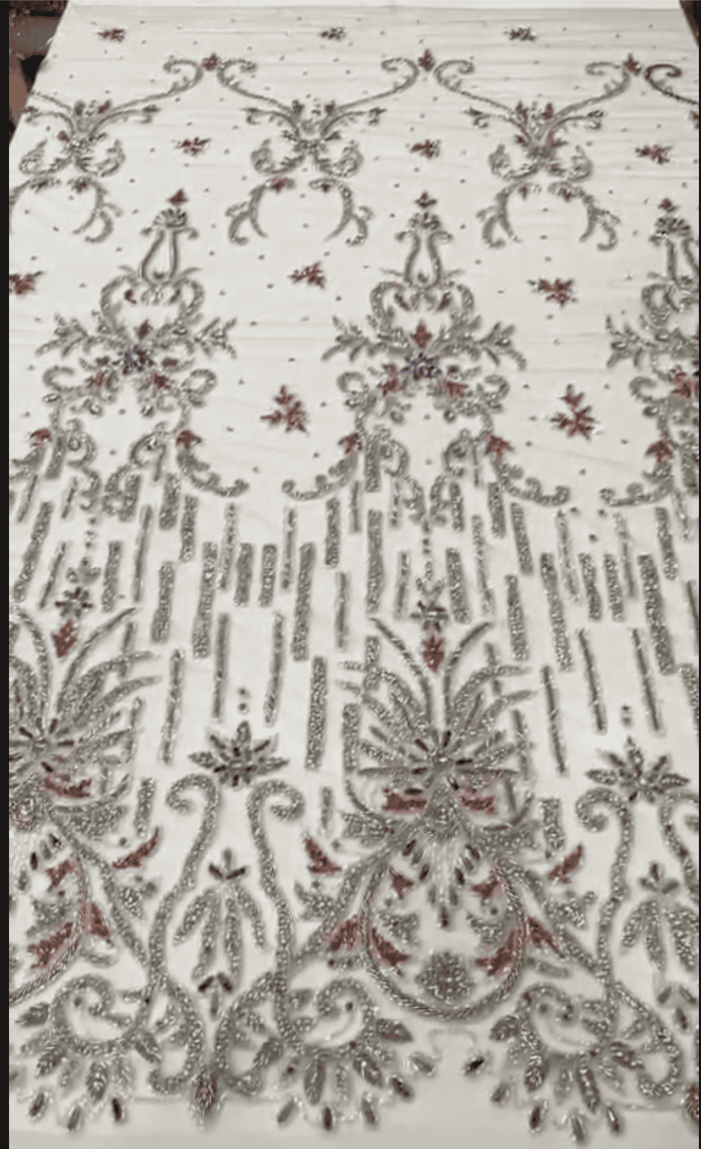 Delicate floral and scroll patterns flow elegantly across the fabric, complemented by vertical bead lines that create a graceful sense of movement. The detailed craftsmanship and balanced color palette make this fabric a perfect fusion of classic elegance and modern luxury.