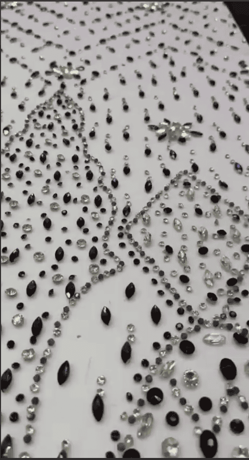 Discover understated glamour with this  Rhinestone Embellished Tulle, designed for sophisticated, statement-making fashion. Set on a clean, soft tulle base, this fabric features a captivating arrangement of jet-black stones, clear crystals, and subtle iridescent rhinestones, carefully placed to create flowing, organic patterns with a refined sparkle.