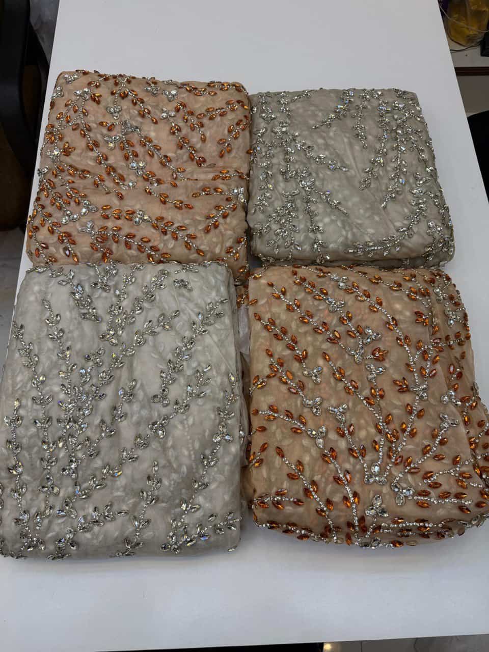 Delicate yet striking, this rhinestone fabrics features an abstract botanical motif brought to life with deep sapphire rhinestones and brilliant crystal highlights. The pattern flows organically across the mesh like blooming vines under moonlight, offering a perfect balance of elegance and opulence.
