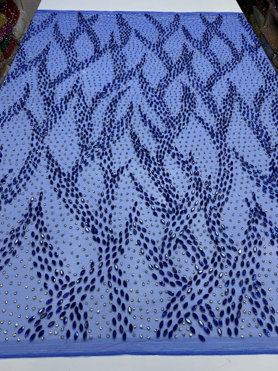 Elevate your look with this stunning royal blue crystal luxury lace, crafted on a soft tulle base and richly adorned with premium navy-blue teardrop stones and shimmering crystal rhinestones.