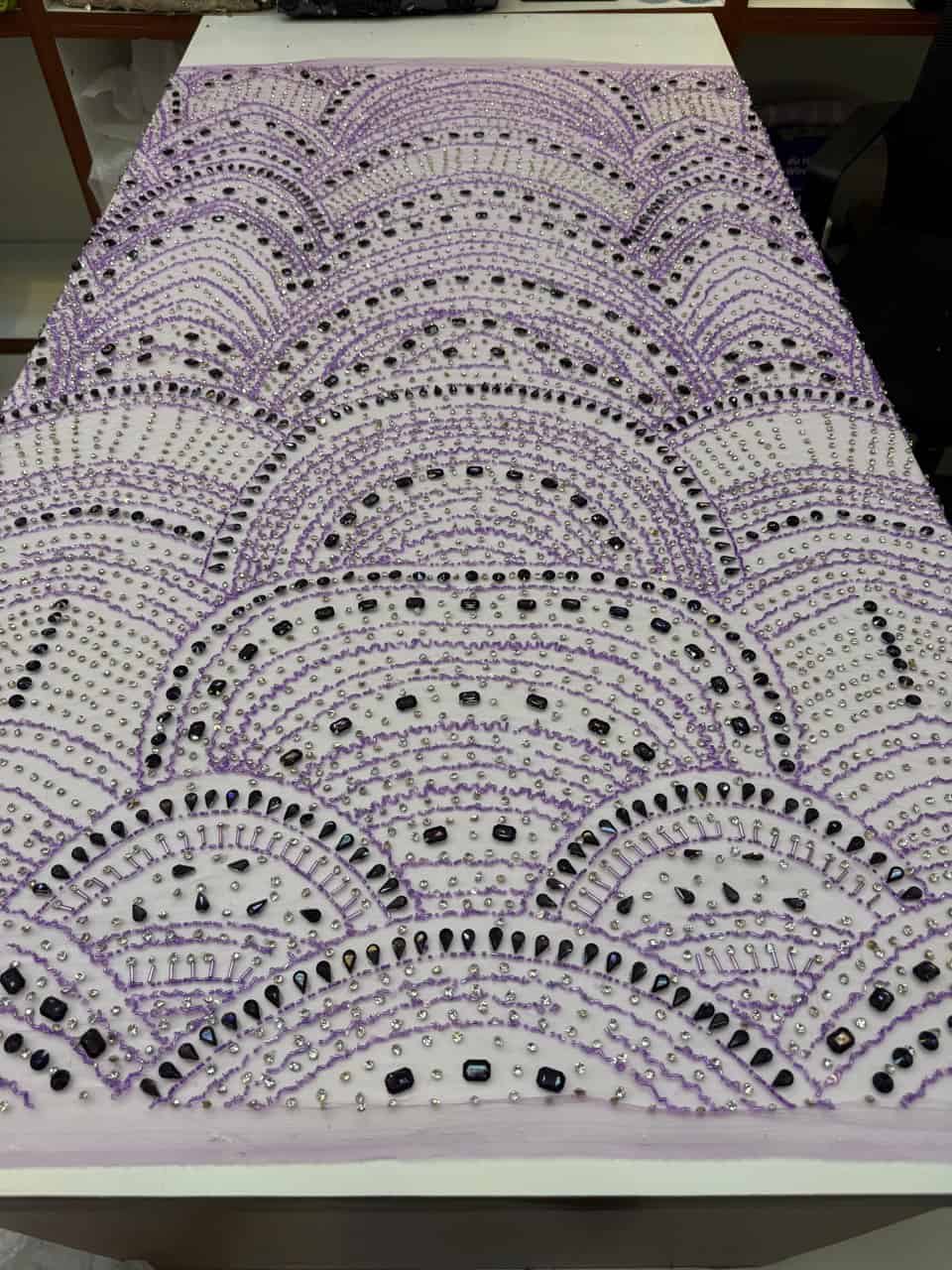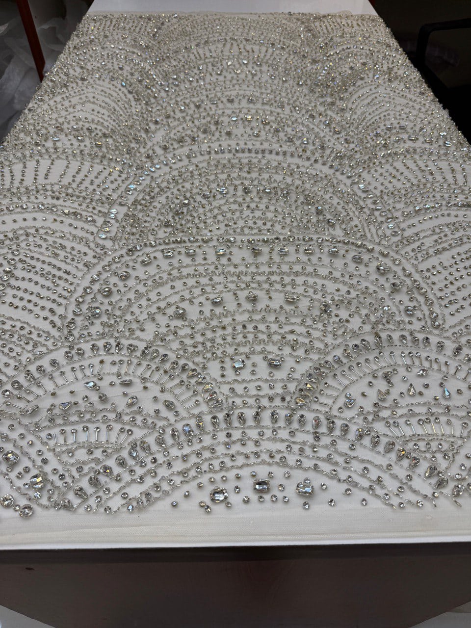This fabric features a meticulously hand-beaded layout that cascades in rhythmic waves, leading into a bold central motif that mimics the elegance of a blooming crown. Each bead and crystal is individually stitched to follow the fluid, flame-like pattern that naturally elongates the body, making it ideal for figure-flattering gown designs.