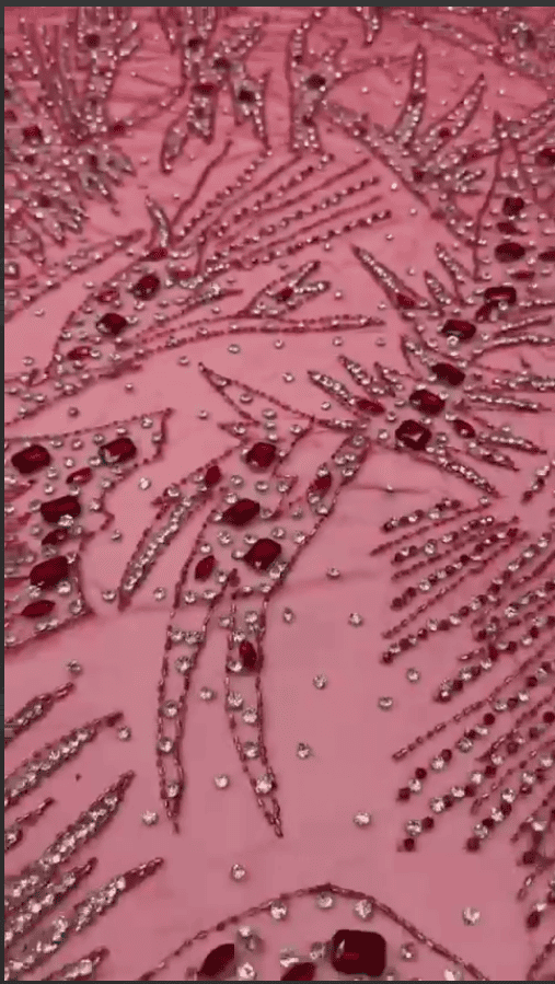 This Blush Pink Crystal & Ruby Beaded Lace is a breathtaking expression of romance and glamour. Set on a soft blush pink tulle base, the fabric features dynamic feather-inspired and radiant burst patterns, richly adorned with shimmering clear crystals, rose-toned beads, and deep ruby embellishments that add depth and intensity to the design.