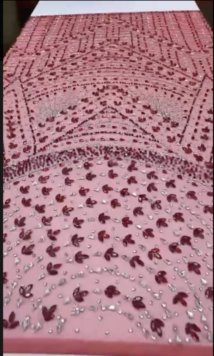 This breathtaking Ruby Blush Crystal Beaded Tulle is a masterpiece of modern couture embellishment. Set on a soft ivory illusion base, the fabric features densely hand-placed crystals, rhinestones, and faceted stones arranged in graceful cascading arches and fan-like patterns.