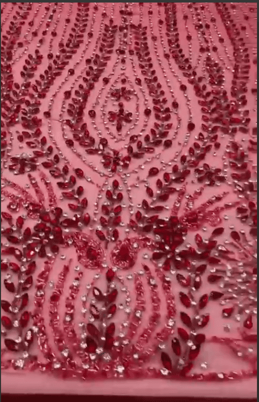 The harmonious blend of ruby and crystal accents creates a subtle yet captivating shimmer, making this fabric ideal for sophisticated couture creations. The intricate hand-applied beadwork forms graceful waves and floral-inspired motifs, offering depth, texture, and a flawless high-fashion finish.