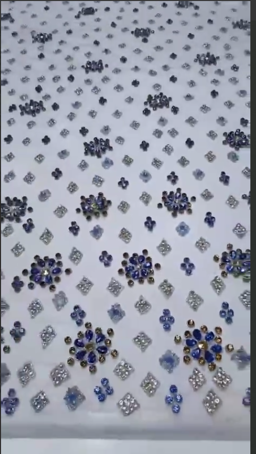 Sapphire Glimmer is a rich and regal statement piece that celebrates opulence. Set on a soft green tulle base, the fabric is adorned with dazzling sapphire-cut stones, sparkling crystal rhinestones, and intricate bead clusters ,creating a look that’s both vibrant and sophisticated.
