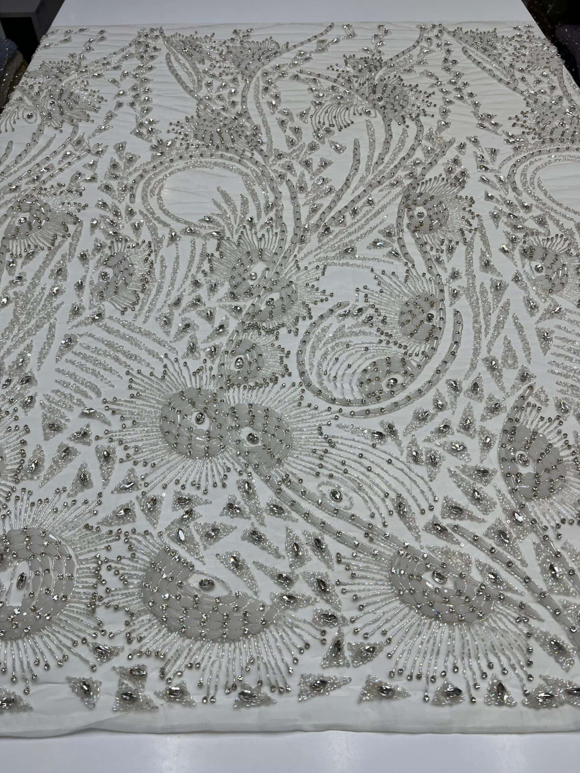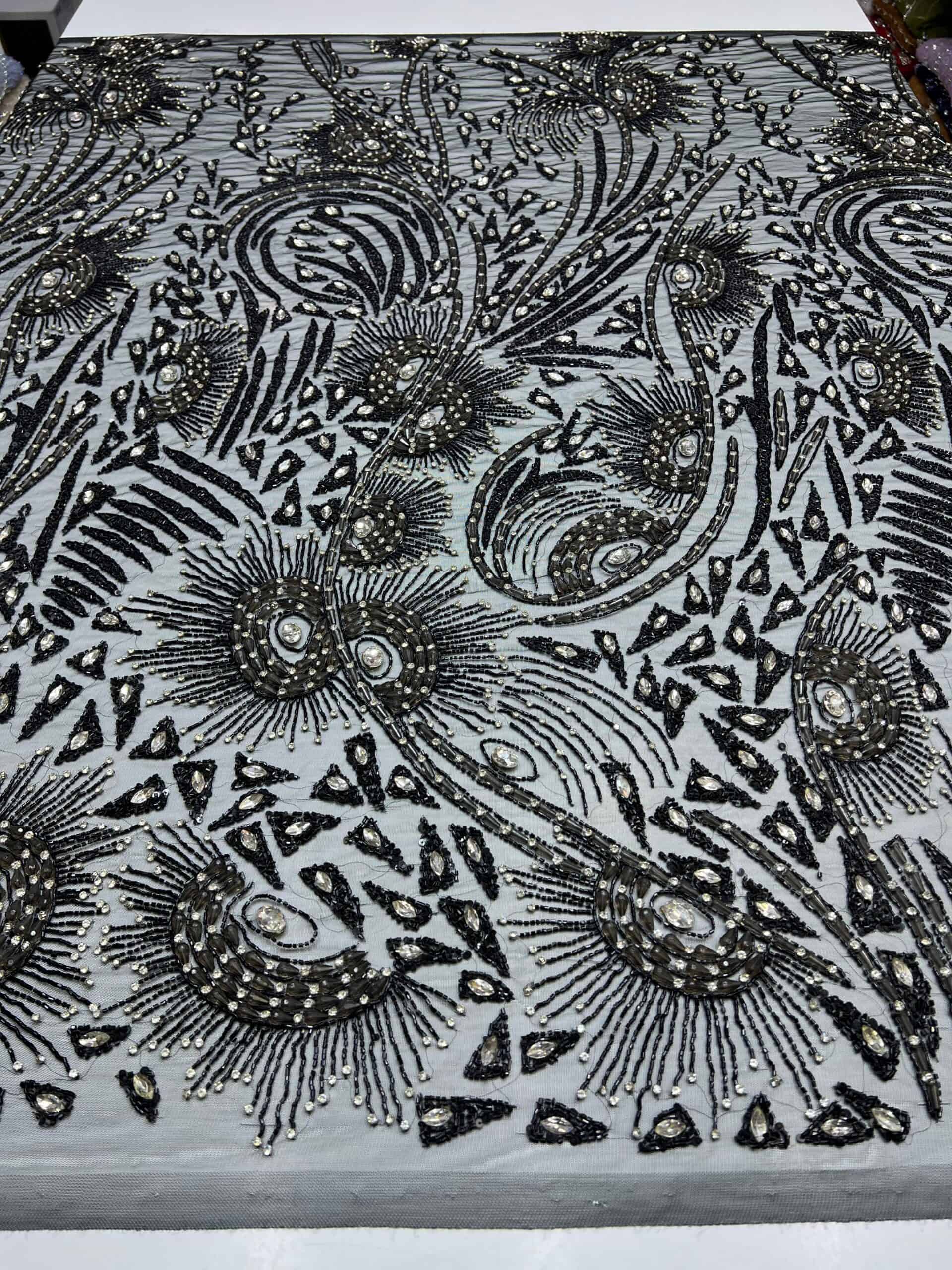 This breathtaking hand-embellished fabric is a masterpiece of artistry and opulence. Designed on a soft, sheer base, the fabric is adorned with intricate beadwork and sequin embroidery, creating a striking interplay of texture, shine, and depth.