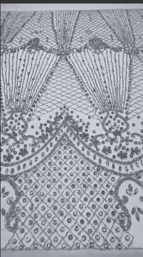 Elevate your couture creations with this silver crystal couture design fabric, featuring a breathtaking arrangement of silver sequins, crystals, and beadwork. Crafted on a soft, elegant base, this fabric showcases a combination of geometric lattice patterns, ornate scalloped motifs, and radiating fan-shaped designs, offering both richness and sophistication.