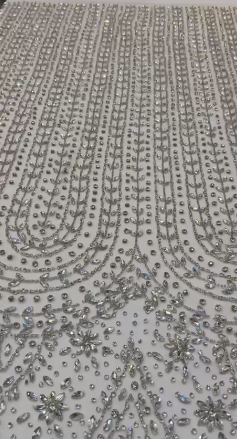 Crafted on a rich silver crystal rhinestone mesh , it features flowing vine-like patterns adorned with sliver rectangular stones and sparkling clear crystals. Each embellishment is meticulously arranged to mimic the graceful fall of petals and droplets, creating a mesmerizing, fluid effect.